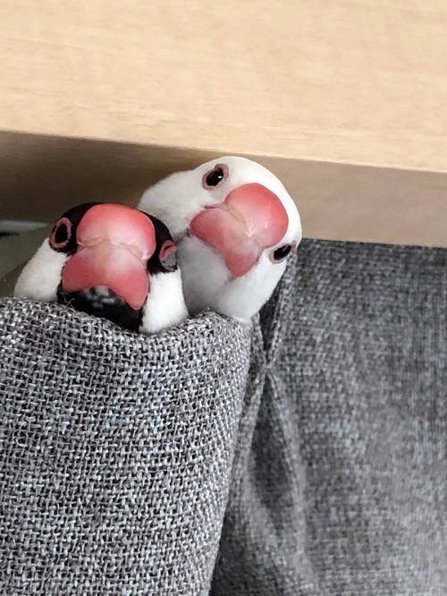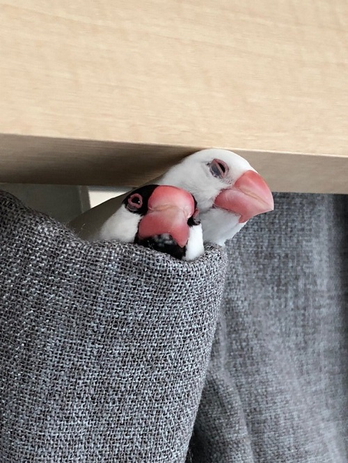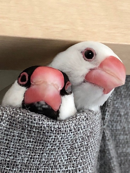 ぴったりくっついている2羽の文鳥たち。仲良しで可愛い姿ですが、これ一体、どこにいるのかわかりますか?