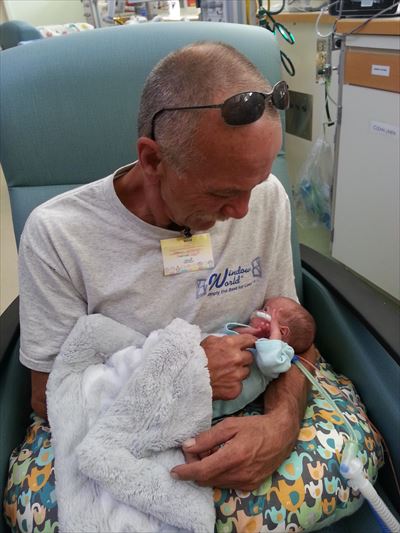 ▼ 生まれたばかりの孫を抱えるお父さんの姿がこちら