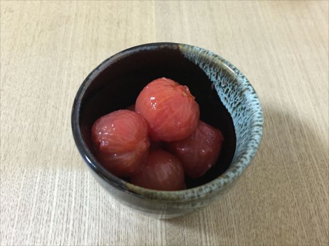 これ、最高としか言いようがない味です!!湯むきしたかいあって、トマトが漬け汁の味をぎゅんぎゅん吸っているし、噛んだ時の美味しさがジュワーっと出てくる感じがたまりません。大きいトマトをまるごと…なんていうのもいいなあ…。