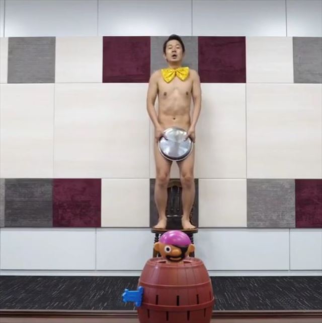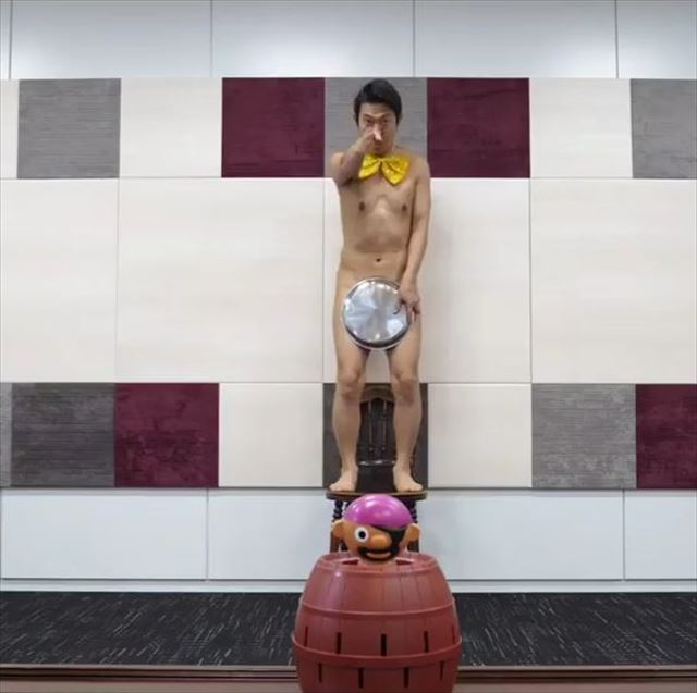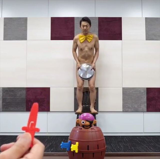 そして、今回はさらに難易度の高い!?裸芸? なんと、あの黒ひげ危機一髪が飛び出した瞬間に股間を隠すようなのですが…。
