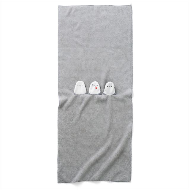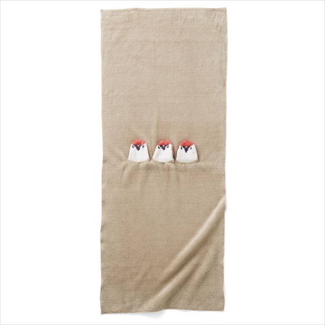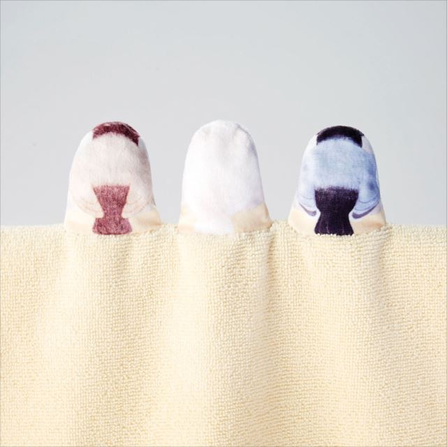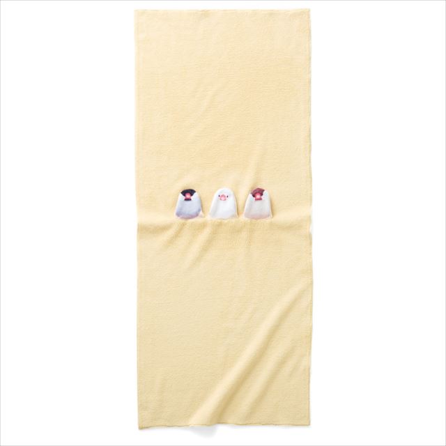 3種色違いの文鳥が並ぶこちらは、クリーム色のタオル。