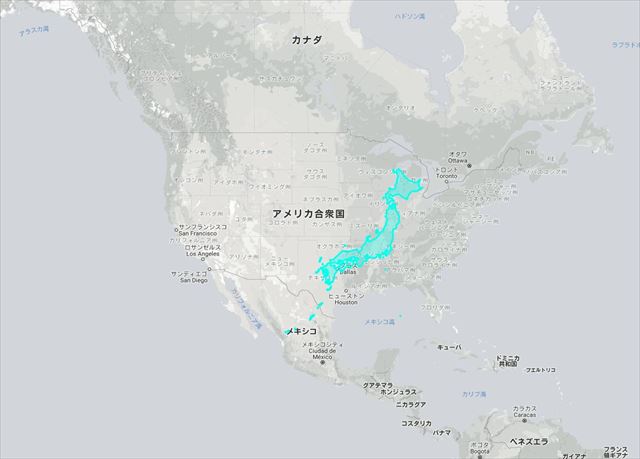 アメリカの方へ持って行くとこんな感じに大きさの比較ができます。ただ、この「The True Size Of …」はメルカトル図法で描かれています。メルカトル図法は、全緯線が一番長い赤道と同じ長さで描かれるため高緯度の面積が拡大されてしまうという特徴があります。