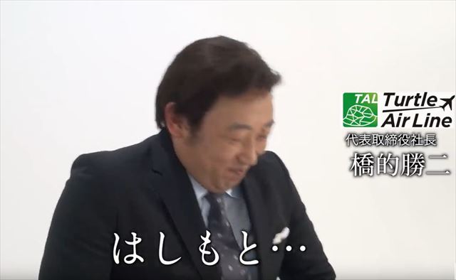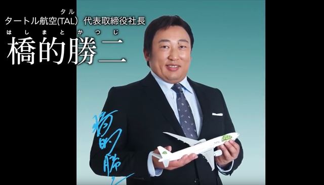 毎回、天才的ななりきりで話題となる秋山さんですが、今回なりきるのは、航空業界の風雲児の異名をとるタートル航空[TAL]代表取締役社長の橋的勝二さんです。
