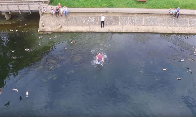とある湖を飛行中のドローン。落下の危機とみるやいなや、男性は湖に入っていきます。