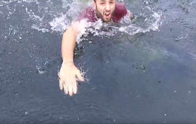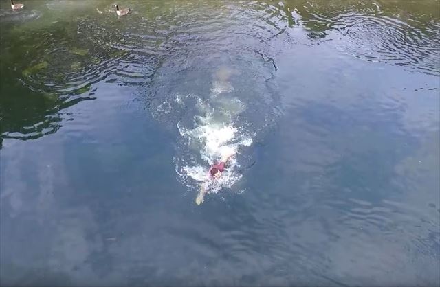 途中から水深が深くなったのかクロールを開始!それにしても、こんな映像はドローンならでは!