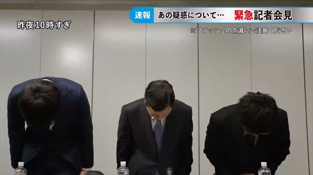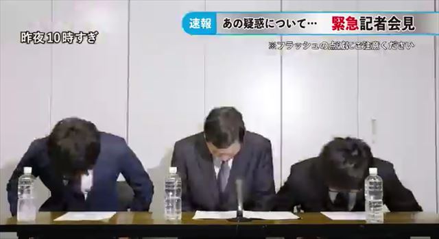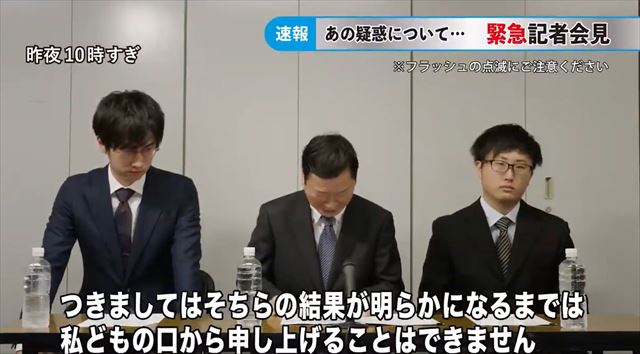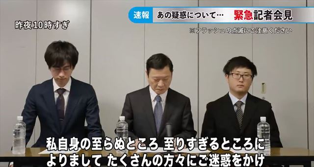 取材陣のフラッシュがすごい。会見の発言内容や流れは、よく見る会見そのものです。