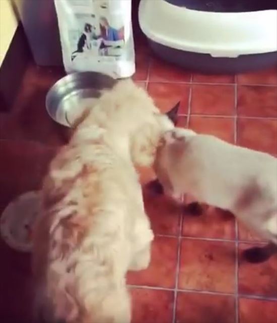 すかさず、「大丈夫だった?よかったよかった」と言わんばかりに、ニャンコの元へかけつけるワンコ。なんとか無事に抜け出すことができてよかったですね!