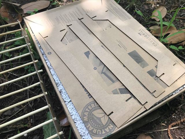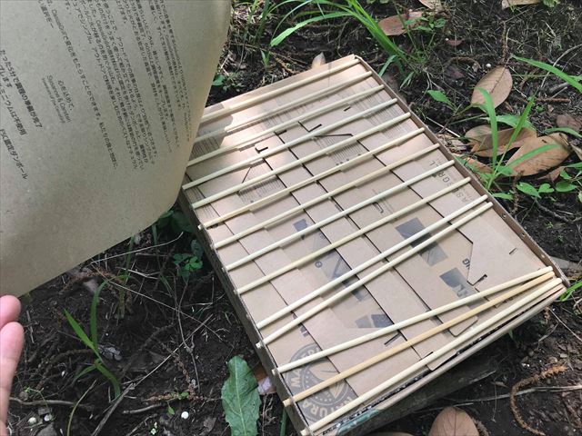 食材を置く網となる竹の棒がダンボールの穴に刺さって入っているし。(すぐ外れたりするけど…)
