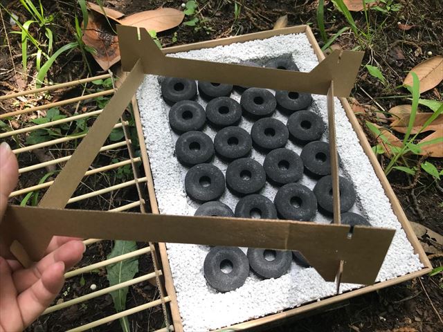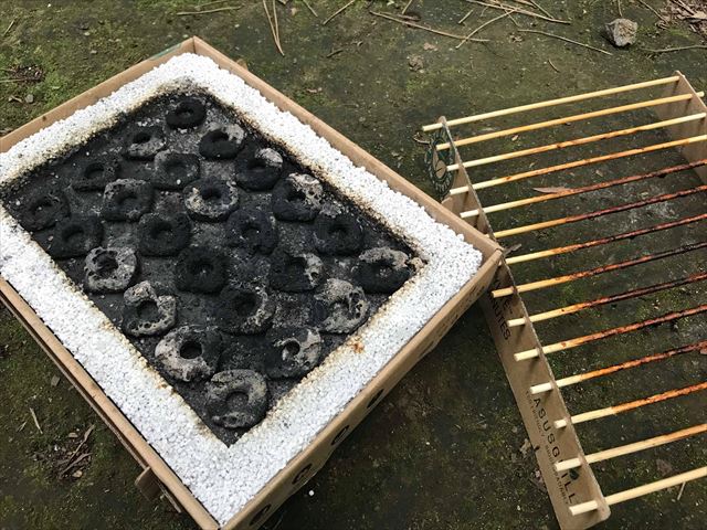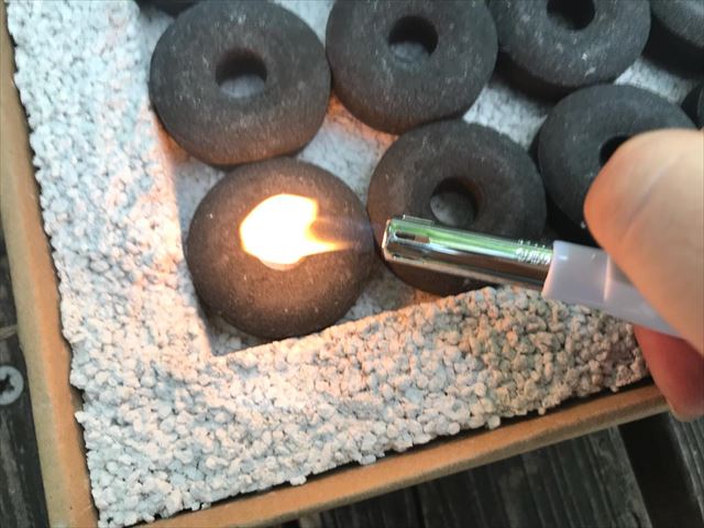 四角にあるチャコールに直接、火を点けてみると煙がモクモクと上がり、じわじわと周りのチャコールに熱が伝わっていきました。