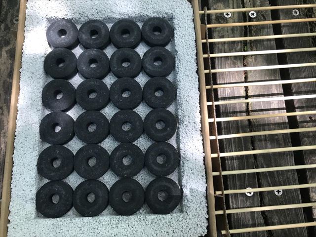 白い火山石の大きな塊をくり抜いたところに、24個のチャコールが敷き詰められている感じ。着火剤を使わなくていいのがまた良いですよね!