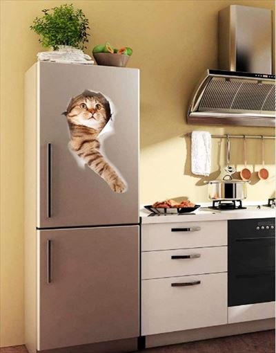 この猫ちゃんの壁紙シールは全部で3種類あり、ガテルさんが最初に投稿した手を思いっきり出しているシールの他にも、このように壁の穴から覗いているような猫ちゃんもいて、3匹セットで販売されているようです。