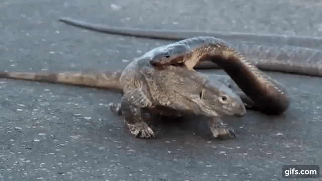 コブラの下あごが完全にオオトカゲの皮膚に食い込んでいるように見えますが、オオトカゲの様子を見るとなんだか平然としていますね。