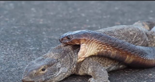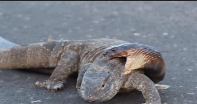 出典:YouTube(Cobra Latches onto Monitor Lizard || ViralHog)