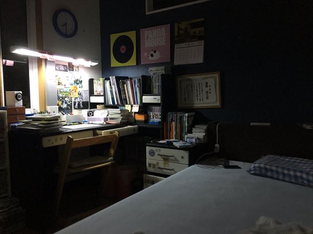 電気をデスクスタンドだけにすると、こんな雰囲気に。現実にありそうなお部屋ですよね。