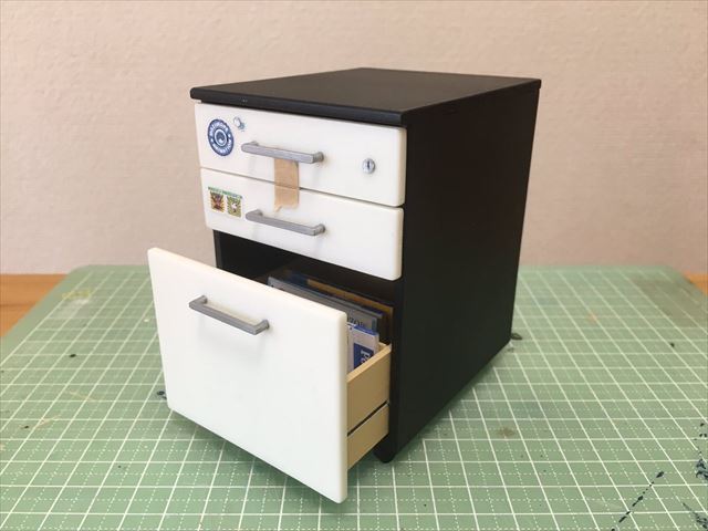 引き出しに貼ってあるシールやガムテープなど芸が細かくて素敵です。