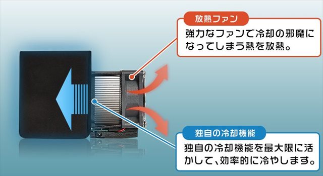 ファンで冷却の妨げになる熱を放熱し、効率的に冷やします。
