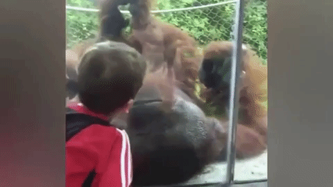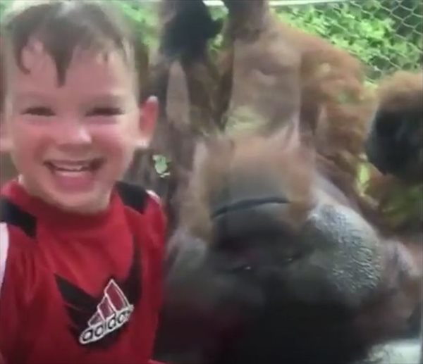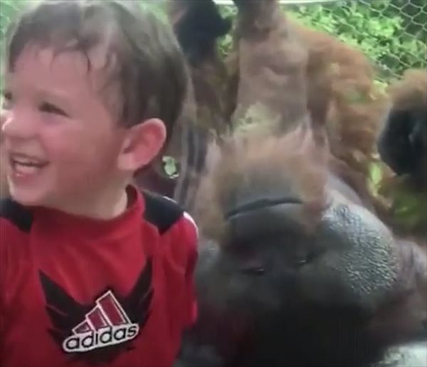 出典:YouTube(Orangutan and little boy share a laugh through glass at the zoo)
