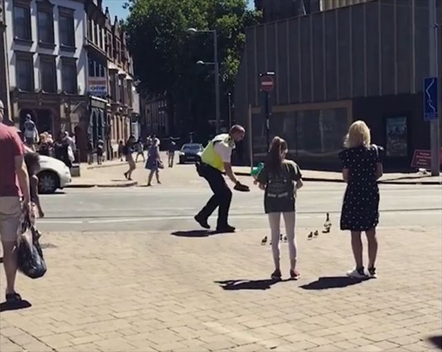 場所はイギリスのノッティンガム。どうやら、車通りの激しい道路だそうで、なかなか渡ることも一苦労な感じの場所です。てくてくと歩くアヒルの家族を誘導する警察官。子供のアヒルも6匹ほどいるようです。