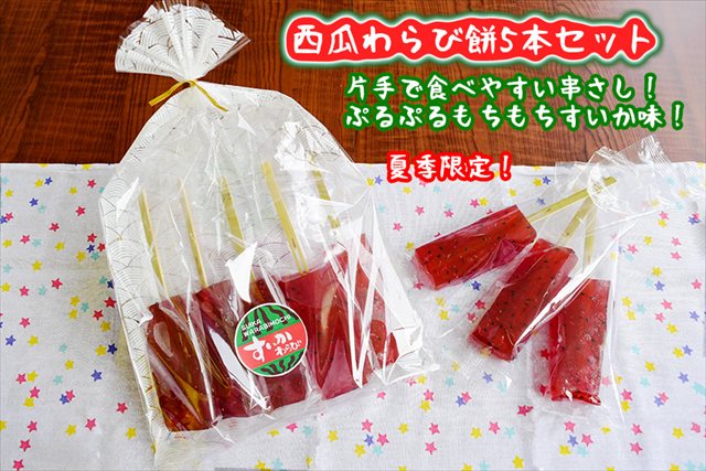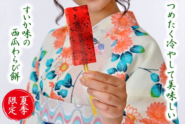 見た目はぷるんぷるんとして、スイカのようなビジュアルのわらび餅。とっても涼しげですよね。黒ゴマでスイカのタネを再現しているのもいいですよね。