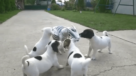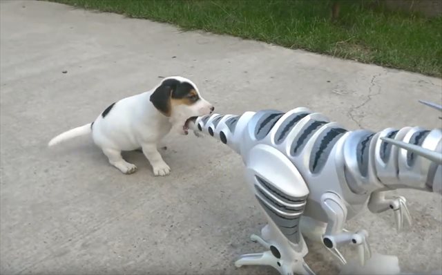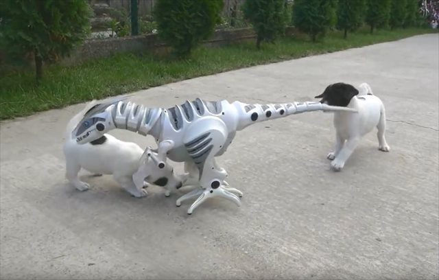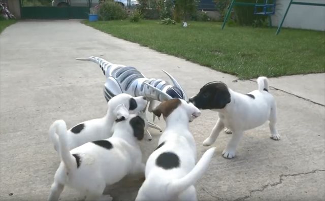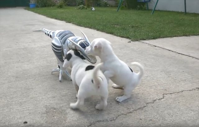 恐竜のロボットに果敢に飛びかかる子犬達 その一部始終が撮影した動画が話題となっているのでご紹介します!