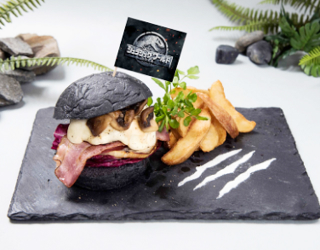 黒いパンが印象的なジュラシック・ワールドバーガー。ガッツリはみ出るお肉はなんと牛肉100%(¥1,390)