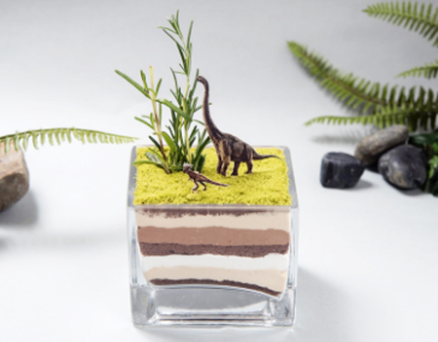そのままオブジェにしてしまいたい。地層パフェ〜草食恐竜の大草原〜。恐竜たちが済む大草原の下の地層をイメージしたとか。(¥1,190)