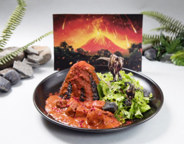 こ、これは…「ジュラシック・ワールド/炎の王国」の舞台、ヌブラル島の活火山をイメージしたカレー。色合いからとても辛そうなイメージですが、辛すぎず食べやすい仕上げだそうです。(¥1,290)
