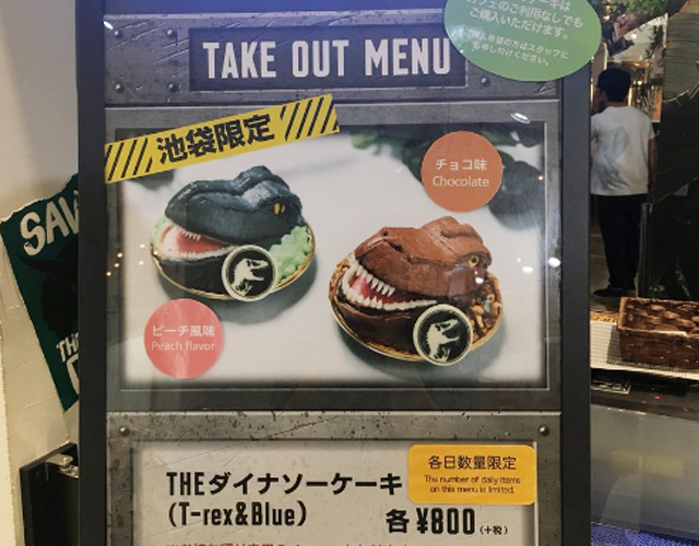ダイナソーケーキはカフェに入店しなくても購入できる人気お土産商品。大人気の「Blue」と「T-rex」の2匹がケーキになっています。映画の興奮を家にお持ち帰り!(¥800)※こちらは池袋店限定商品※各日数量限定
