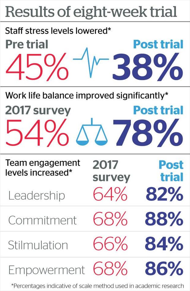 また、週休3日になったことで、ストレスの度合いも45%→38%に減少しています。さらに、リーダーシップやコミットメントといったそれぞれのパフォーマンスも約20%上昇するなど、全ての項目において大きな成果が見られました。
