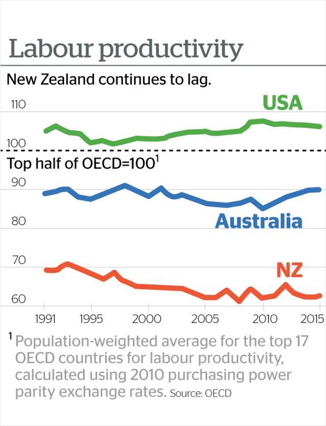 ちなみに、こちらはニュージーランド、アメリカ、オーストラリアの労働生産性を比較したグラフ。ニュージーランドの労働生産性の低さが顕著です。
