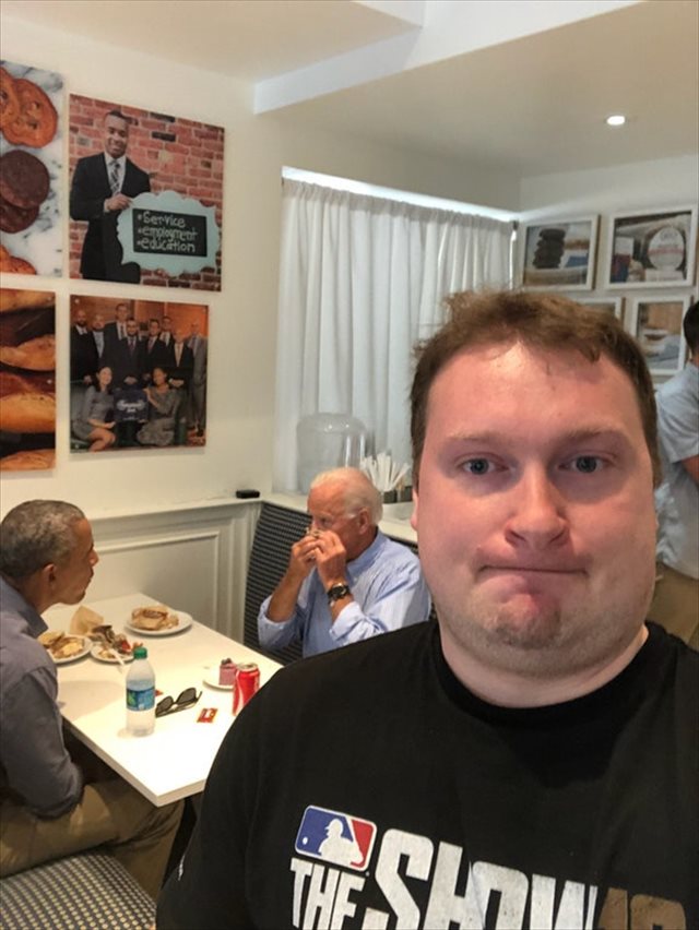 米国のとあるレストランで自撮りをしたという男性。ただ、自撮りと言いつつも、後ろにいる方々をメインで撮影しているように見えるのは気のせいでしょうか。つまり、自撮りをするフリをして後ろにいるすごい人達を撮っていた!?