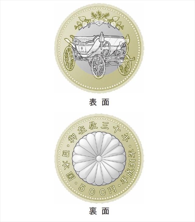 財務省は、天皇陛下御在位30年を記念するための貨幣を発行することを発表。ひとつは「一万円金貨幣」。もうひとつが「五百円バイカラー・クラッド貨幣」です。