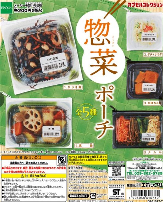 「カプセルコレクション・惣菜ポーチ」は、全5種類。お馴染みの惣菜がラインナップされています。価格は200円で、8月10日(金)からカプセル自販機で販売がスタートします。