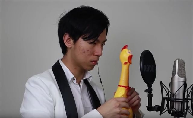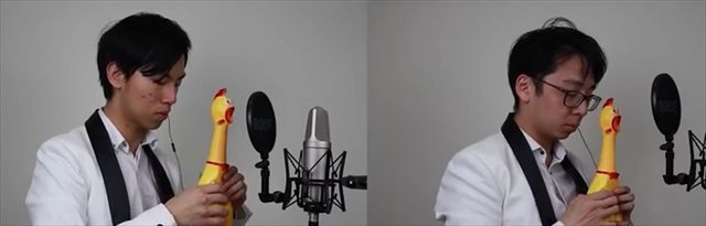 動画では、お二人がそれぞれのパートを演奏していますが、チキンの玩具で奏でているとは思えないほどの見事なハーモニー。思わず見入ってしまいます。タイトルはずばり「Chicken Wedding」。