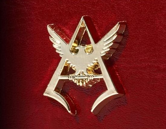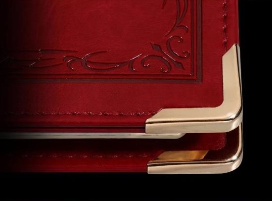 深紅のPU製カバーの表面には、合金製のシャア・アズナブルのパーソナルエンブレムが付属。品格を感じさせるエンブレムが印象的です。