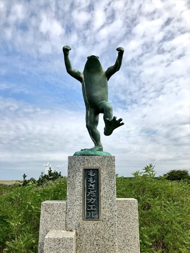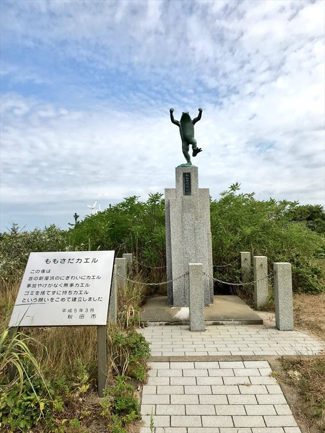その像とは秋田市の新屋海浜公園に建っている「ももさだカエル」。ガッツポーズにも見えますし、大阪・道頓堀で有名なグリコのポーズなんかにも見えてきます。いずれにせよ、躍動感があってエネルギッシュですよね!