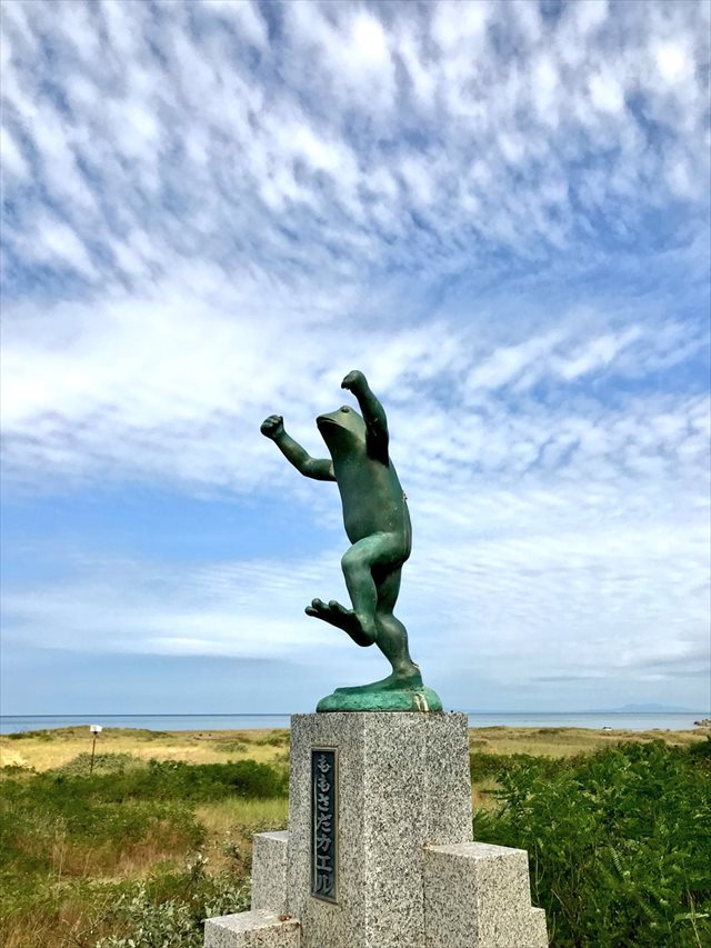秋田市の海沿いにある筋肉質なカエルの像が、Twitterで話題となっているのでご紹介します!