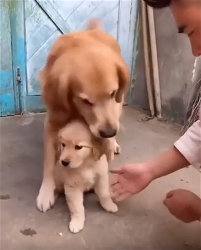 「うちの子に触らないで!」と言わんばかりに、パパ犬ががっちりとガード!