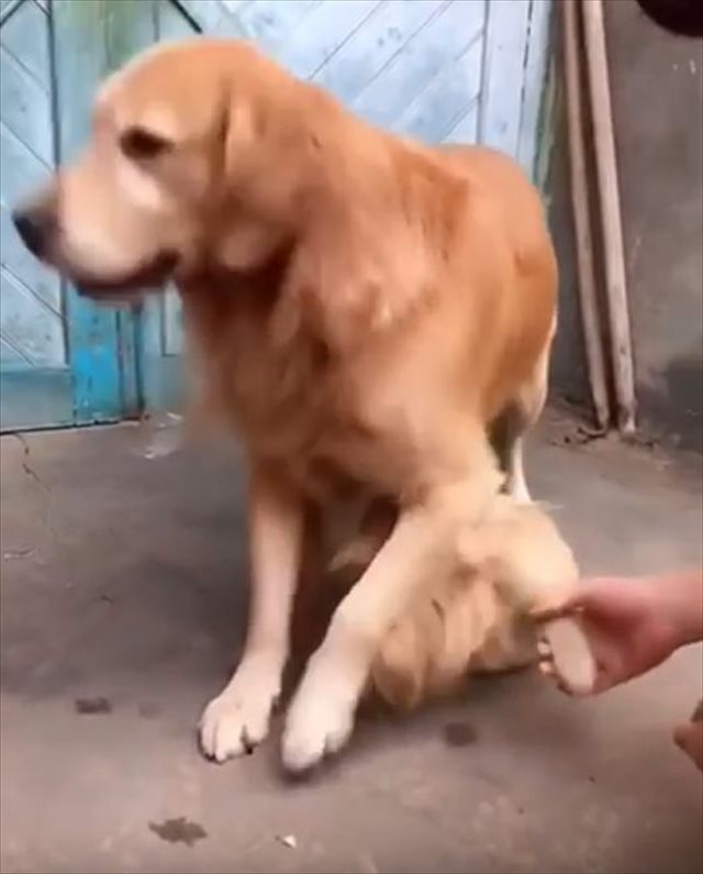 それでもあきらめない男性は、子犬の前足をつかみます。