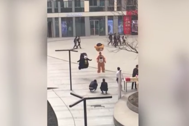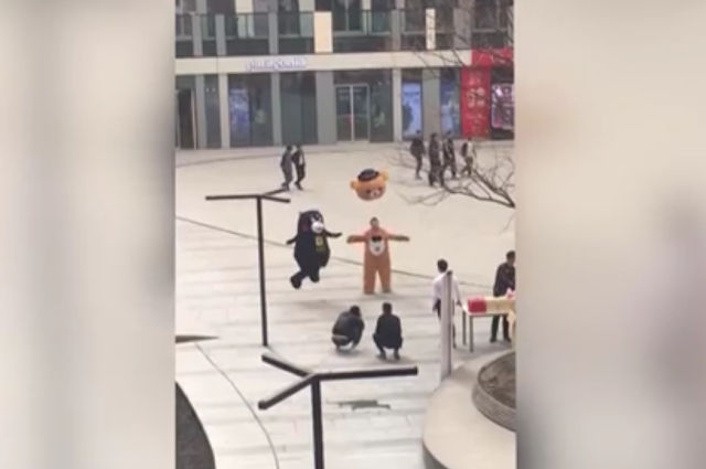 可愛いキャラクターの着ぐるみの撮影が行われている街角で、とある珍事件が起きてしまいました。