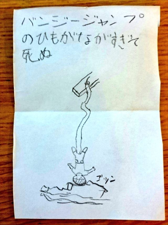 出ました「バンジージャンプのひもがながすぎて死ぬ」(笑)
