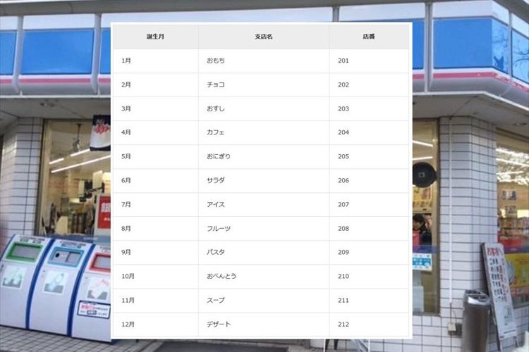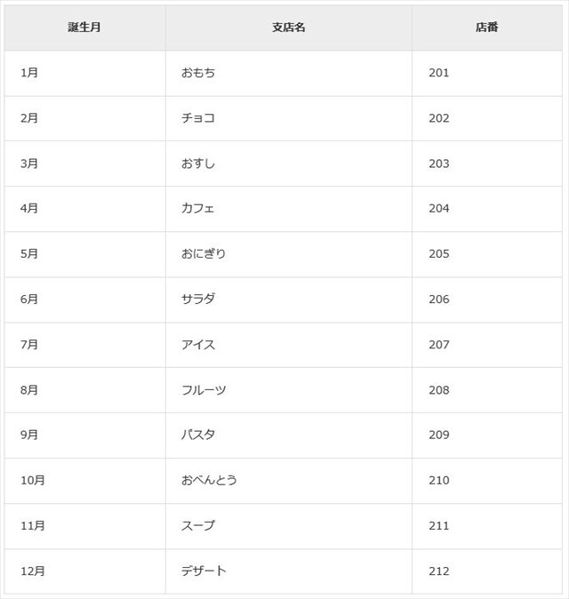 1月生まれなら「おもち支店」、5月生まれなら「おにぎり支店」… なんだか可愛らしくて親しみがわきますね。1月がおもちで2月がチョコといったあたりは、お正月やバレンタインデーを意識しているのでしょうか? 定かではありませんが…。