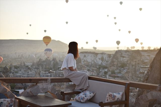 まさに魔法の世界のようですし、洞窟ホテルのテラスというのも興味深いです。