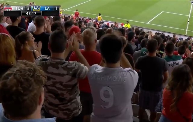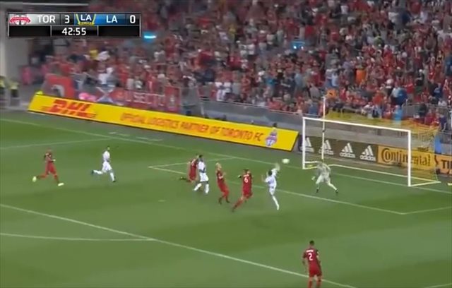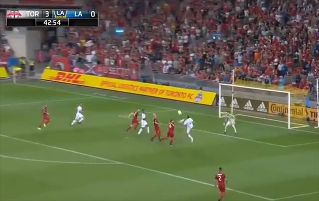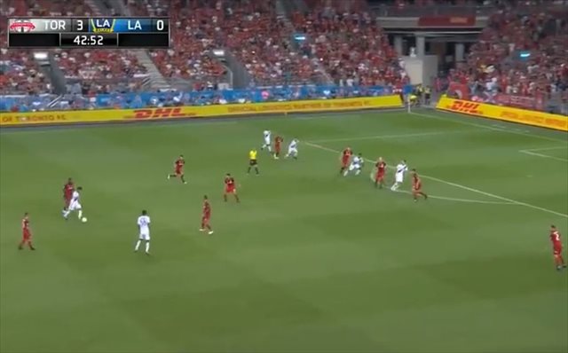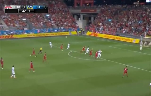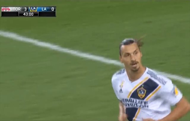 そして、こちらが今回話題となっているゴールです。味方から前線にいるイブラヒモビッチ選手にボールが供給されます。