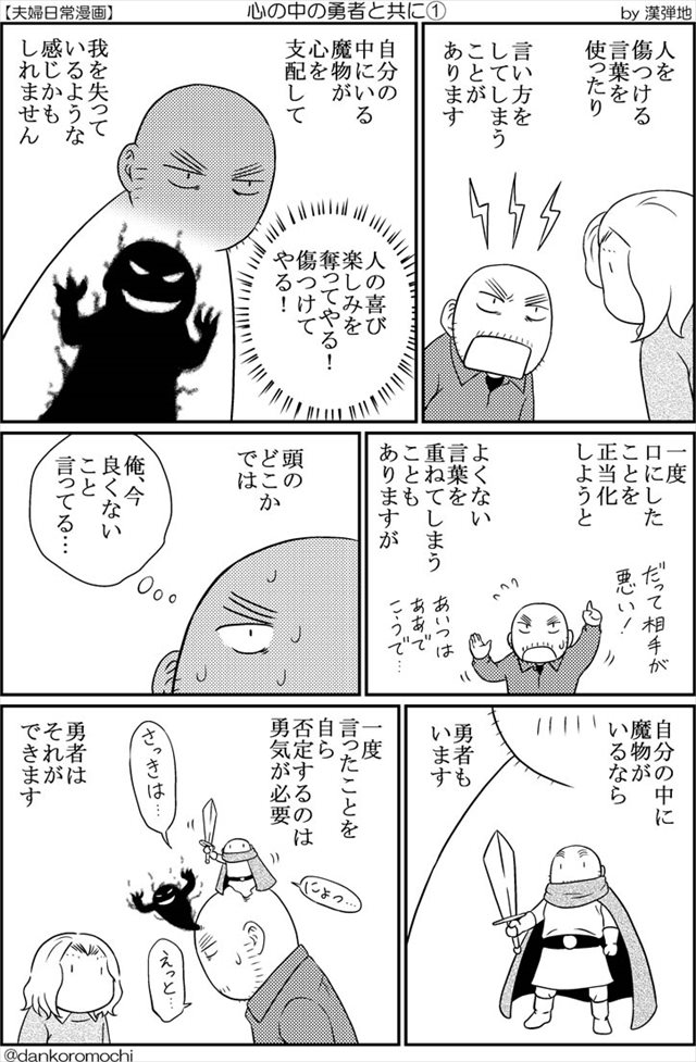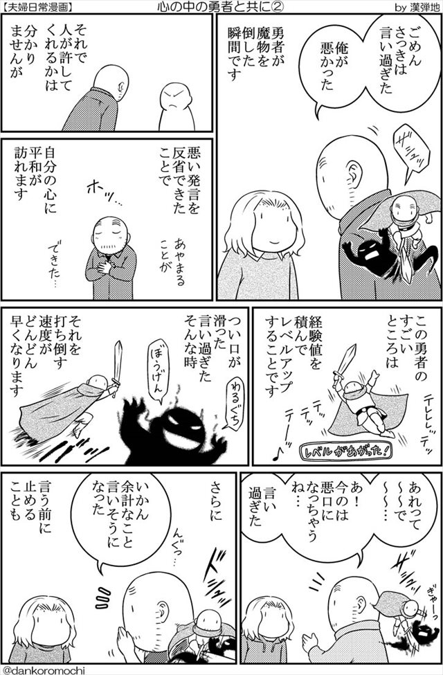 誰もが心の中に勇者をもつ一方で、魔物も潜んでいる…。しかし、経験を積んでいく度に勇者が魔物を早めに退治してくれる。謝ることに前向きになれるということは素晴らしいことですよね。