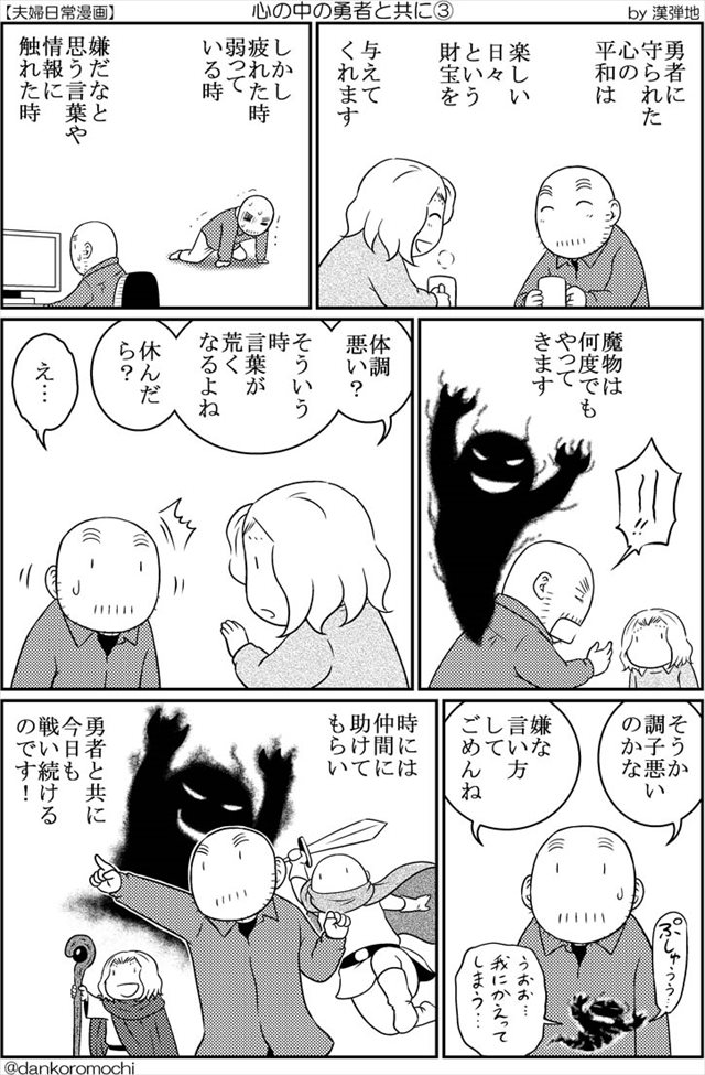 今回Twitterに投稿されて話題となっているのは、そうした悪意がわいてしまった時に頼りになる「心の中の勇者」を描いた漫画です。