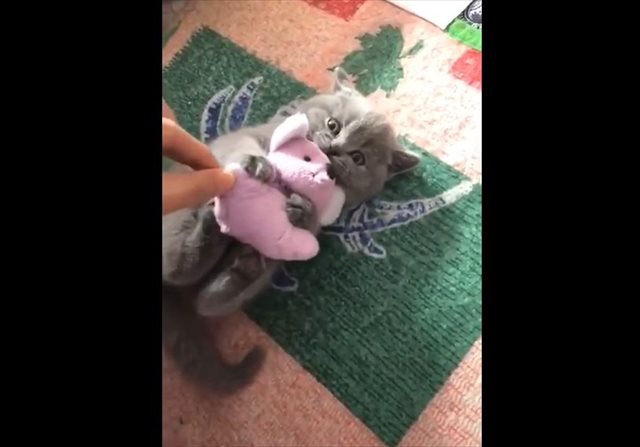 飼い主さんは、その後は攻め方を変えて、ぬいぐるみをつまんで持ち上げようとしますが、ここでも必死の形相でぬいぐるみを手放さないニャンコ!絶対にぬいぐるみを手渡してはくれません。