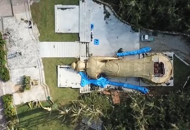 台風24号が過ぎ去った9月30日、沖縄市の東南植物楽園内に設置されている高さ約25メートル、重さ約40トンの「琉球金宮観音菩薩像」が倒壊しているのが発見されました。