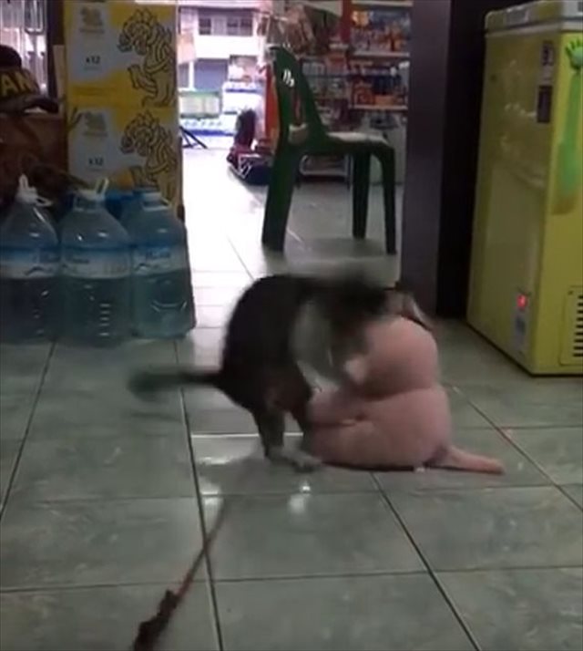自身と同じくらいの大きさのぬいぐるみをにらみつけて、今にも怒りが爆発しそうなニャンコ。雰囲気が殺気だっています。そして、次の瞬間でした…