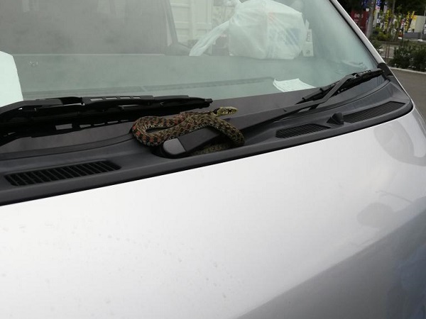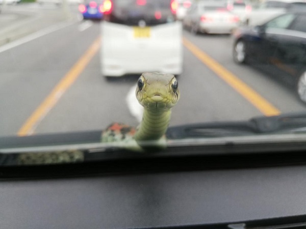 こちらは、Twitterユーザーのおじくまver.26(@ComOjikuma)さんが車で走行中に、フロントガラスにひょっこり現れたヤマカガシ。一体いつからそこに乗っていたのかは不明です!